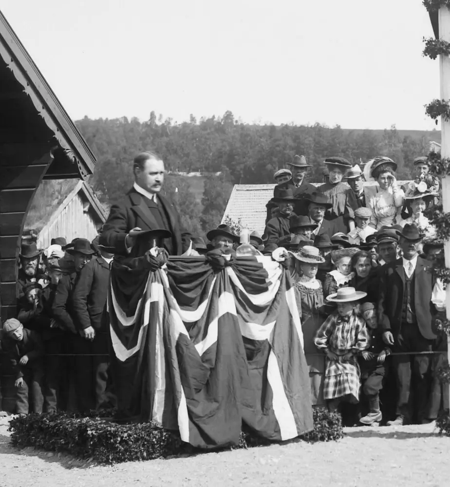 Christian Thams holder tale på Svorkmo stasjon under Thamshavn-Svorkmobanens åpning 10. juli 1908. Foto: Ukjent / Orkla Industrimuseum.